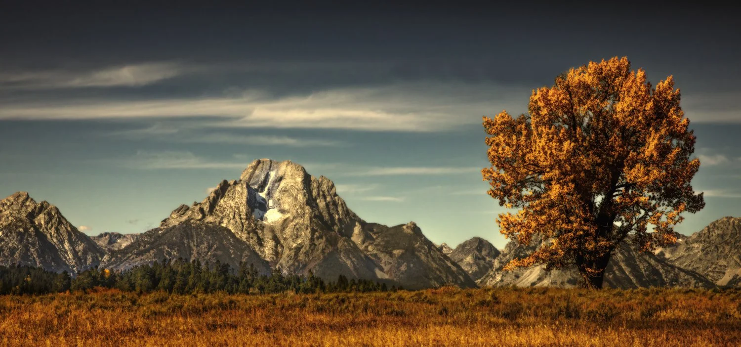 In the fall, along the Snake River Road in Wyoming, leaves turn a phosphorescent golden yellow color against the brilliant dark sky; the lone tree appears almost three-dimensional against the landscape of the Grand Tetons.